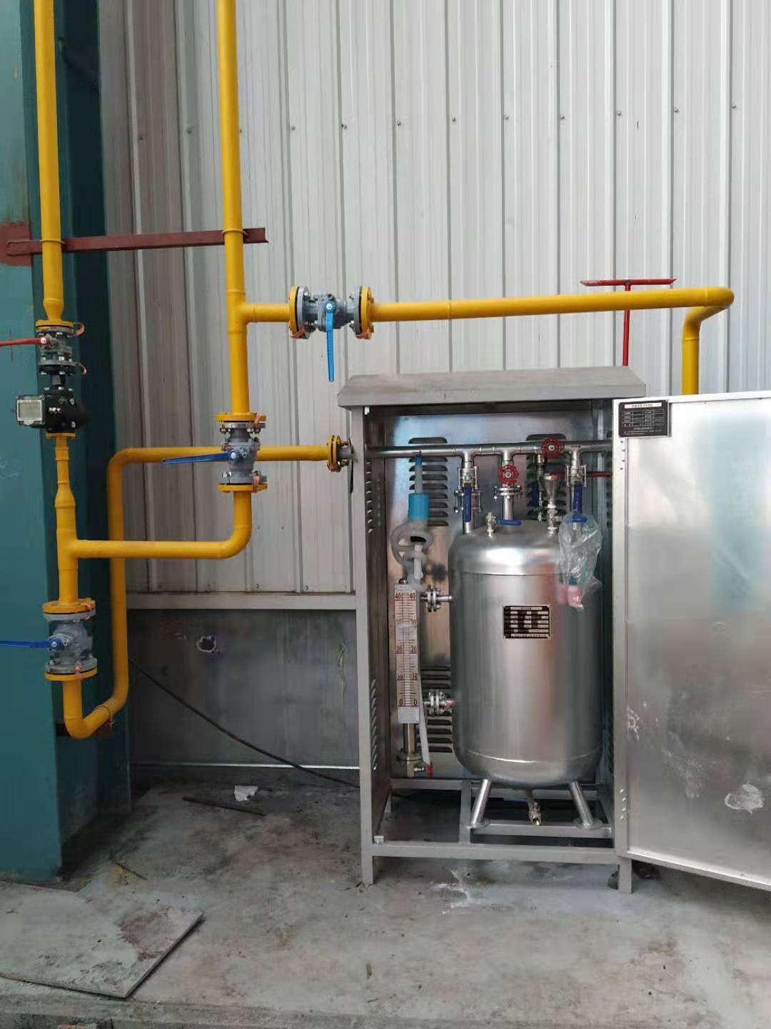 本產品為氣液自動混合裝置,是我公司自有知識產權,委托燃氣設備制造有限公司生產。主要用于工業燃氣與添加劑的預混。液態添加劑預先加入混合柜,氣體通過混合柜后可進行自動均勻混合,從而改善工業燃氣的相關性能,達到預期目的。