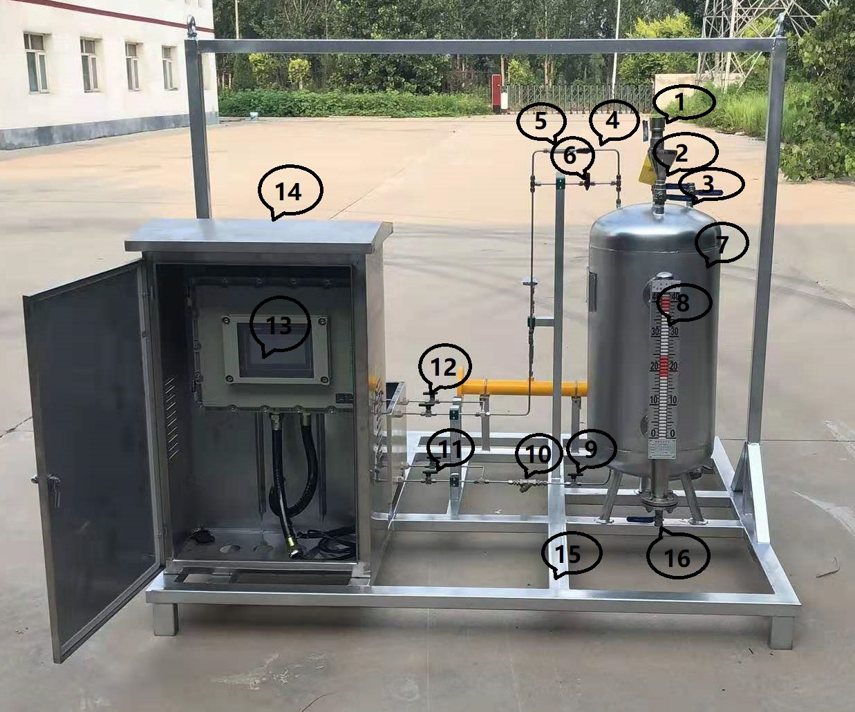 本系統為管道天然氣用,有源全自動增效劑添加裝置;型號為RT-ZN-100L,設計最大添加量為V=1000ml/h,設計日常使用壓力小于0.4兆帕。本系統采用不間斷220V交流電源供電,防爆PLC采用流量計實時標況流量信號,自動控制雙定量泵輪流工作,按照預設比例,均勻的向天然氣中投放天然氣增效劑。