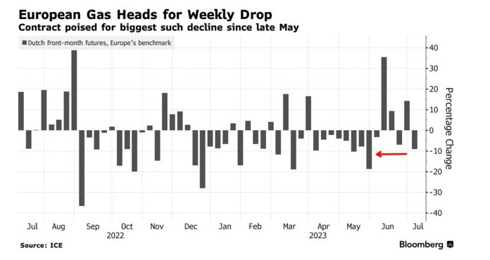 歐洲天然氣期貨預計將實現5月底以來最大單周跌幅,因庫存上升和工業需求低迷超過了供應和天氣相關風險。