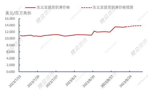 截至8月22日,東北亞現貨到港中國(DES)價格為13.502美元/百萬英熱,環比(08.15)上調1.521美元/百萬英熱,漲幅為12.7%;TTF現貨價格為13.558美元/百萬英熱,環比(08.15)上調1.989美元/百萬英熱,漲幅為17.19%。、主流消費地現貨價格呈上漲趨勢,歐亞需求整體保持穩定,澳大利亞罷工事件再度引起歐洲市場恐慌,市場炒作心態較強,帶動各地現貨價格上漲。