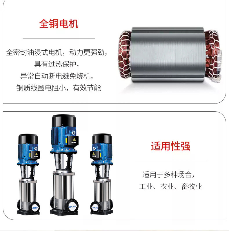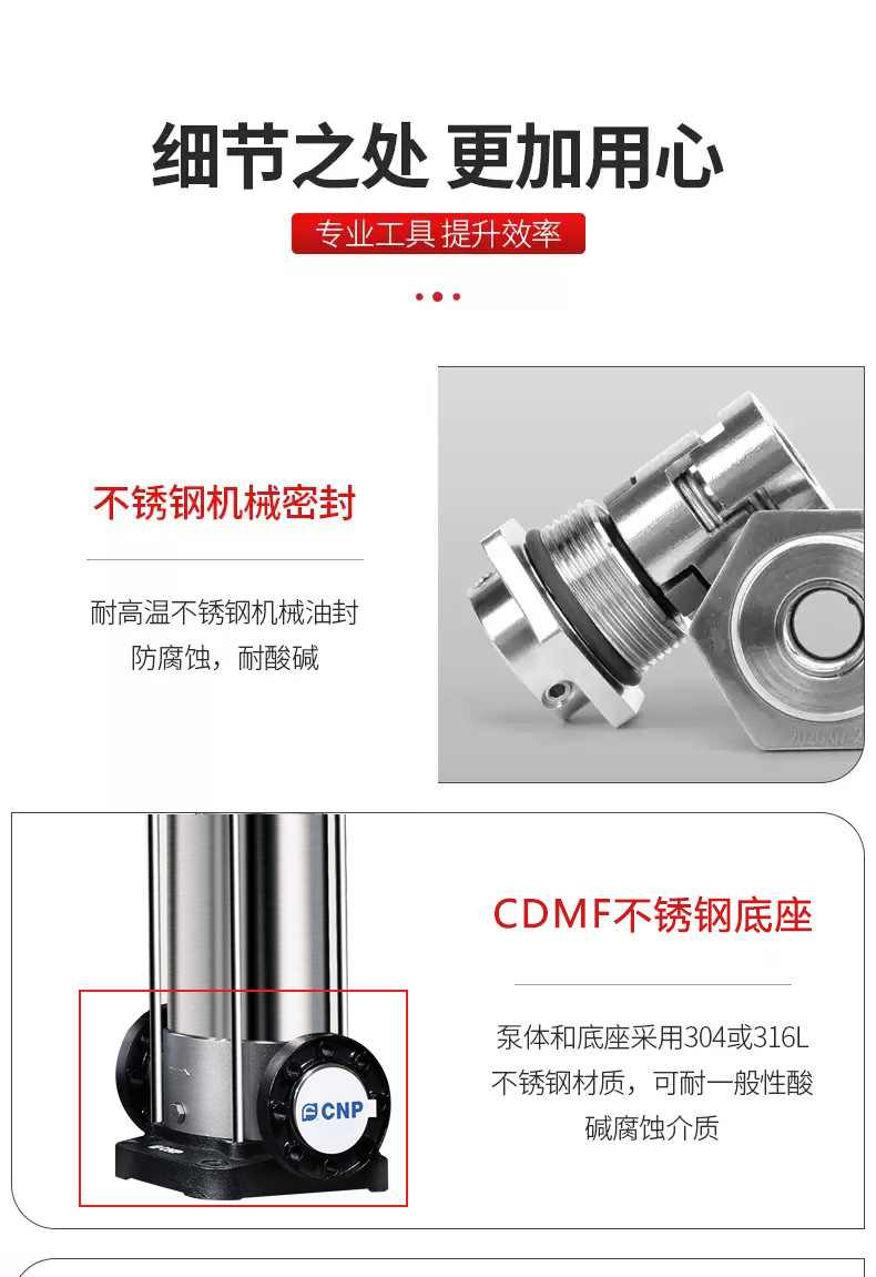 南方CDM/CDMF系列為參照歐洲標準最新自主研發的新一代、高效率非自吸立式多級離心泵。產品采用全新的工業設計,能效指標達到MEI≥0.7,具有節能、低噪、環保及機構緊湊、外觀美觀、重量輕、使用維護方便、可靠性高等特點。