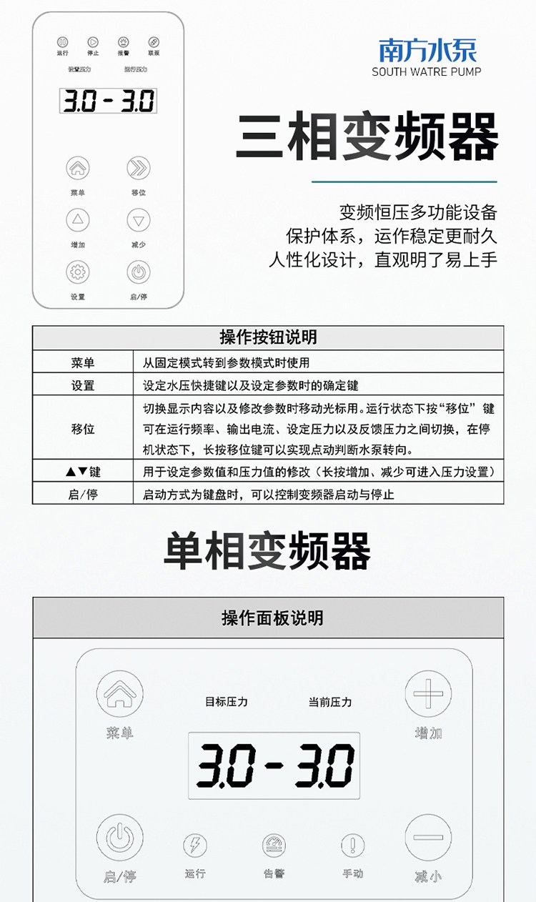 南方CHME系列臥式智能恒壓變頻泵采用了變頻調速及自動化控制相結合的技術,配合高效節能的CHM非自吸輕型臥式多級離心泵。整機主要由CHM泵、控制器、傳感器、壓力罐、五通止回閥及軸向抗震壓力表等組成。具有性能穩定、高效節能、全自動智能控制、低噪音、耐腐蝕、結構緊湊、外形美觀、體積小、重量輕等特點。